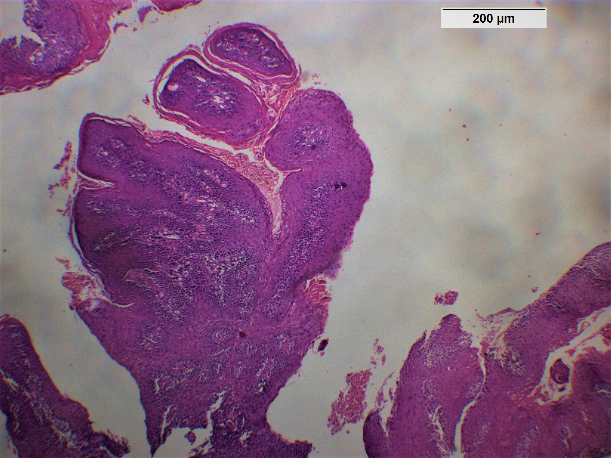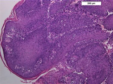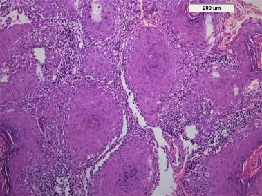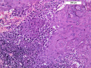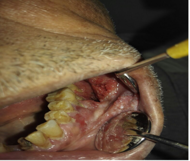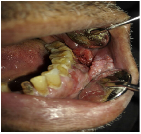 85 years old male came to the clinic suffering from painful ulcer in the left buccal mucosa related to the lower first and second molars. The patient stated that this ulcer appeared three months ago and was preceded by long standing reddish white lesion. The related molars have grade 3 mobility upon clinical examination.
