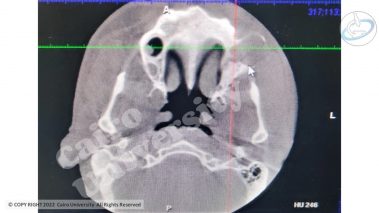 A 43-years old male patient suffered from an intrabony swelling in the left maxilla with 3-years duration. Upon intraoral examination, bucco-palatal swelling was detected which was related to non-vital upper left first and second molars. Aspiration biopsy was positive when performed on the buccal side of the swelling, while it was negative on the palatal side. Radiographic examination revealed well-defined multilocular radiolucent lesion.